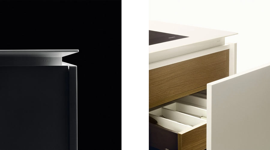 Le cucine della seria K sono concepite per andare oltre il limite l'estrema sintesi della tecnologia che salta subito all'occhio e sfocia nella pulizia formale del "cubo-cucina". L'estetica rigorosa incontra la performance dando vita a una teatrale scenografia tecnologica. Il piano scorre sulla cucina monoblocco e si trasforma in una penisola snack. C’è tutto quello che serve sotto il top-penisola scorrevole della cucina anche un miscelatore abbassabile che consente la chiusura totale del piano.